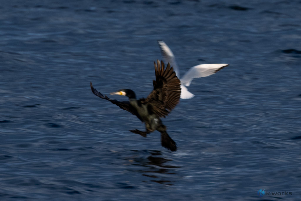 そうこうしているうちに、今度は「ウミウ」と思われる鳥がカモメを威嚇?している様子が撮れました。
